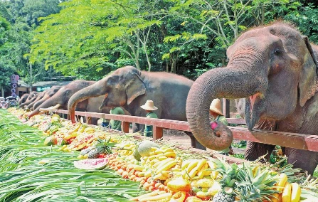 8月12日,西雙版納野象谷景區的亞洲象在享用果蔬大餐。