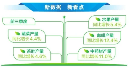 今年前三季度,全省蔬菜產(chǎn)量2338.75萬噸、同比增長4.4%,水果產(chǎn)量1188.38萬噸、同比增長5.4%,茶葉產(chǎn)量53.97萬噸、同比增長4.6%,咖啡產(chǎn)量4.50萬噸、同比增長12.4%,中藥材產(chǎn)量61.10萬噸、同比增長11.0%。