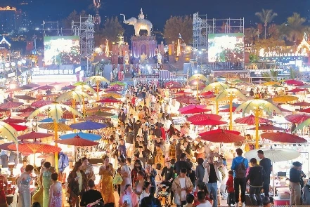 華燈初上,西雙版納告莊星光夜市流光溢彩、游人如織,休閑娛樂、文化體驗、游覽購物等多元業態吸引全國各地的游客紛至沓來。為迎接冬日旅游季,星光夜市陸續推出了傣泐公主年終巡回展演、水上歌舞展演、陸路巡游等活動,豐富游客冬季旅游體驗。(記者 黃興能 攝)