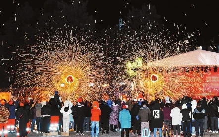 圖①:近日,昆明市西山區海口街道山沖社區開展的迎新春活動上,風火輪映襯打鐵花,盡顯非遺魅力。記者 黃興能 攝