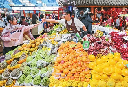 國慶中秋雙節臨近,我省節日市場紅紅火火、購銷兩旺。在昆明大觀篆新農貿市場,節前采購的市民和游客絡繹不絕,時令水果、蔬菜肉食、海鮮水產、中秋大餅等商品琳瑯滿目,市場供應充足,價格穩定。(記者 楊崢 陳飛 攝)