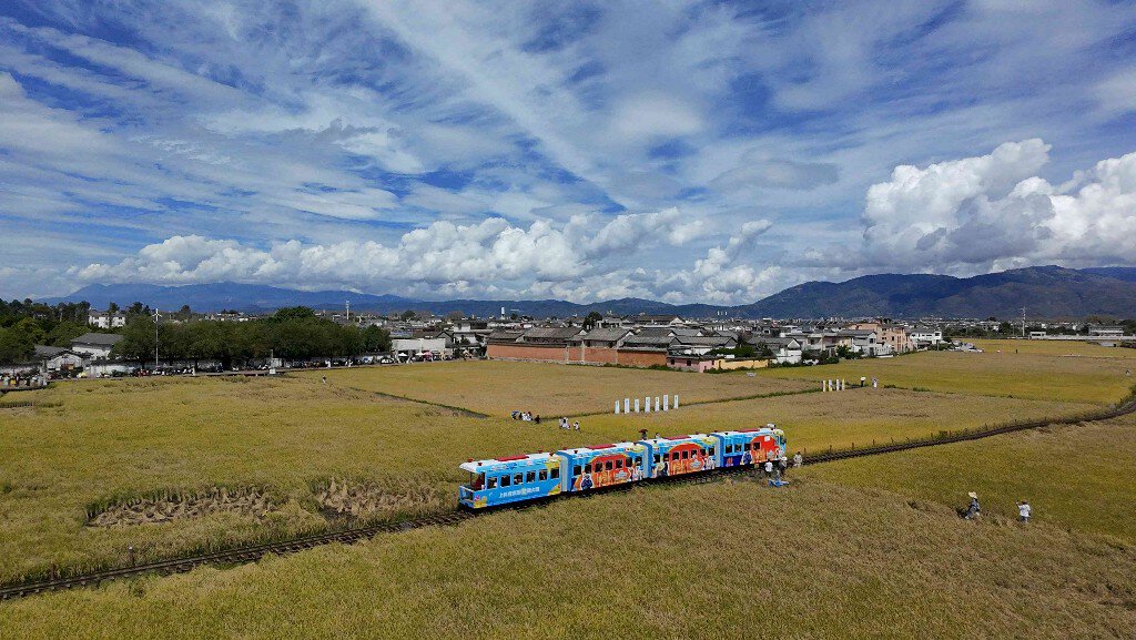 在喜洲鎮(zhèn)金色稻田之間,巨型稻草貓巴士、黃牛與勞作扎象相映成趣,一列列穿梭于稻田中的小火車成為社交媒體焦點。大喜之洲公司通過“稻田+鐵路”場景再造,將傳統(tǒng)農耕區(qū)轉化為沉浸式文旅空間。