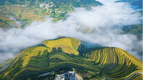 今年10月,那耶村藝術基礎建設全面完工,“云上稻香”的文化地標正式亮相。如今走進村寨,游客既能登上觀景臺,將萬畝梯田的“碧色天梯”盡收眼底;也能走進美術館,欣賞藝術家的在地創作;還能參與壯語課堂、壯戲體驗等非遺活動,沉浸式感受“自然+藝術+文化”的三重魅力。