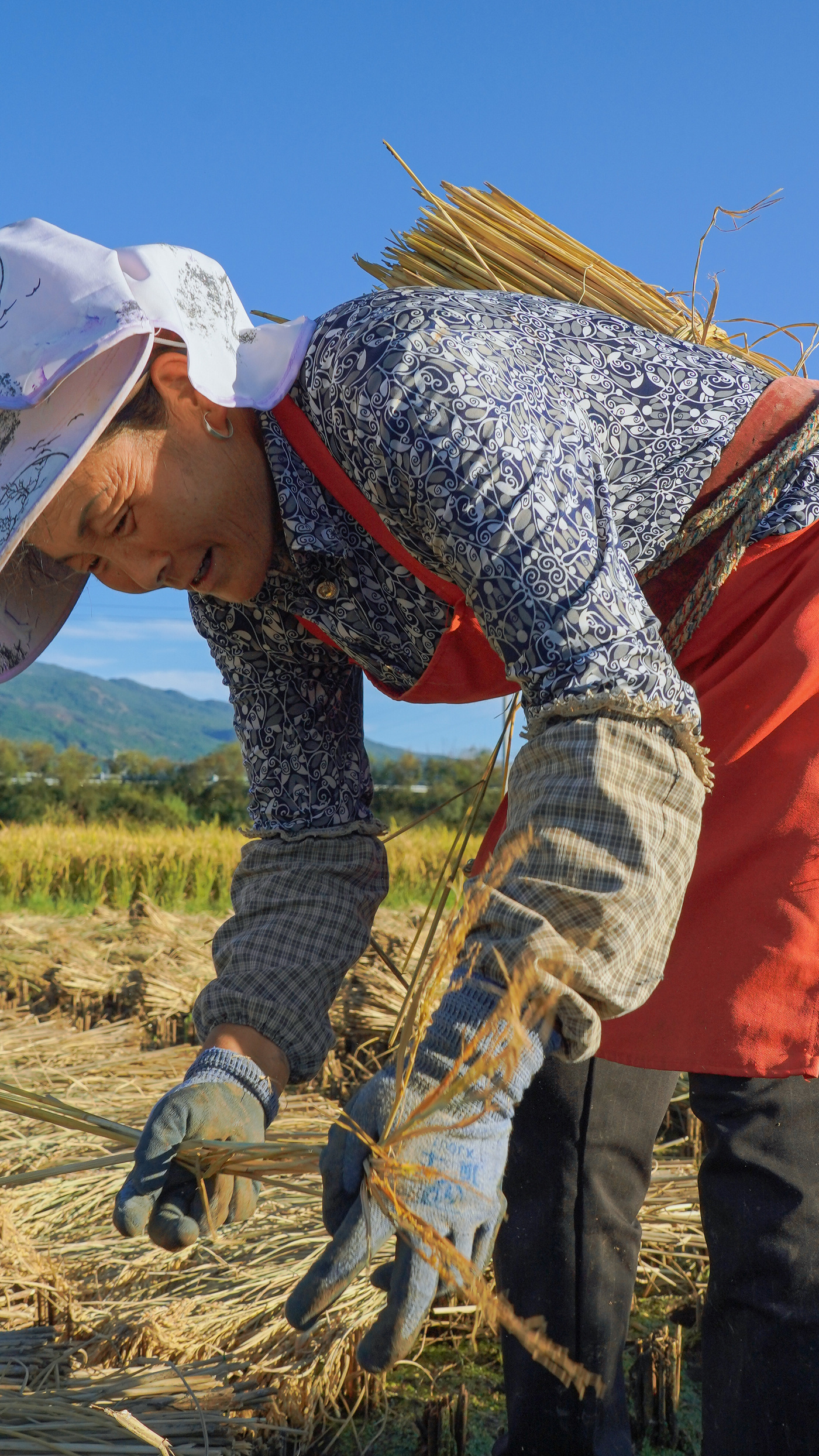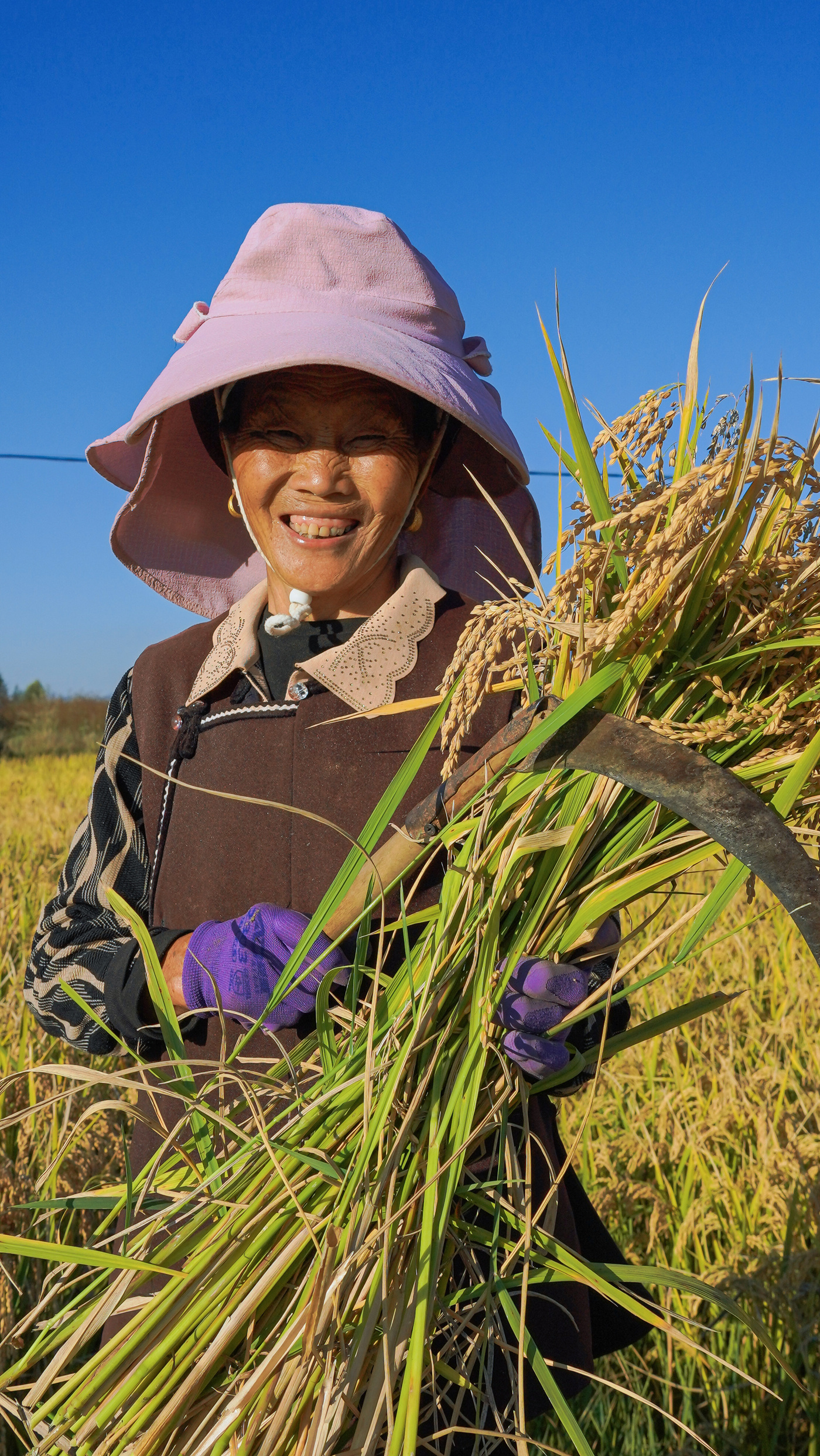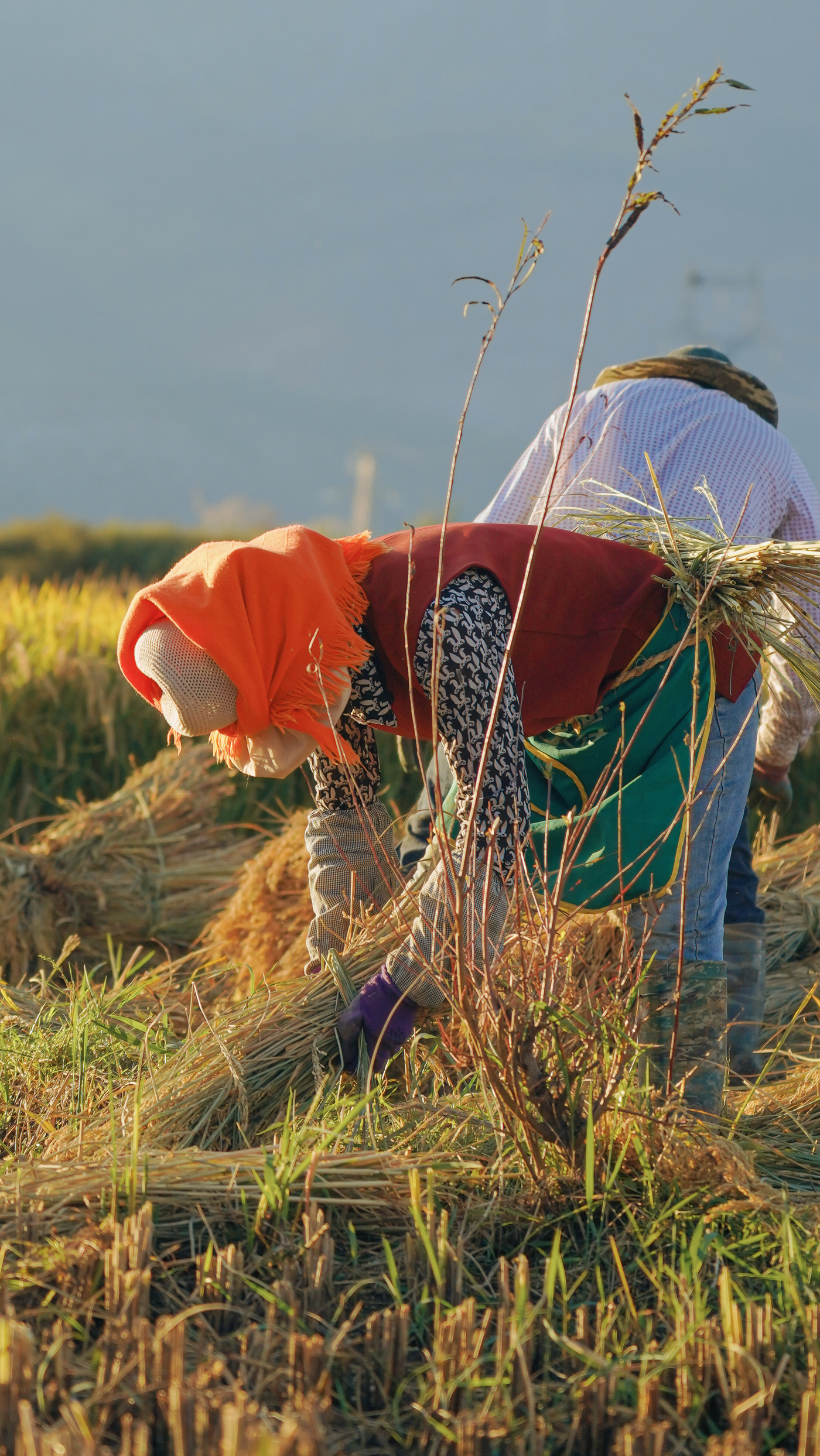 田間地頭,一派熱火朝天的豐收圖景徐徐展開,現代化旋耕機轟鳴著在田壟間高效往復,所過之處,稻稈被整齊地收割、脫粒;同時,許多經驗豐富的農人依然俯身彎腰,手持磨得锃亮的鐮刀,熟練地揮割、捆扎,確保每一株稻穗都顆粒歸倉。金黃的稻谷與人們忙碌的身影,在秋日陽光下構成一幅動人的畫卷。
