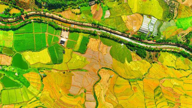連片的水稻田順著地形鋪展