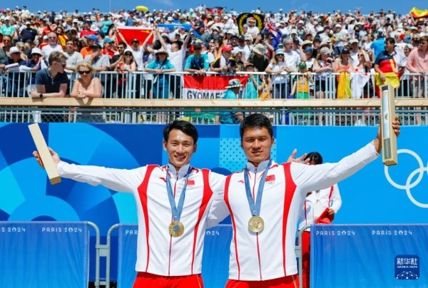 2024年8月8日劉浩(右)在巴黎奧運會皮劃艇靜水男子雙人劃艇500米決賽中奪得金牌。圖源:新華社
