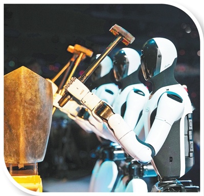 智能人形機器人敲擊“青銅句鑃”,從海上絲綢之路破浪而來的寶船,跨越時空,承載精神。