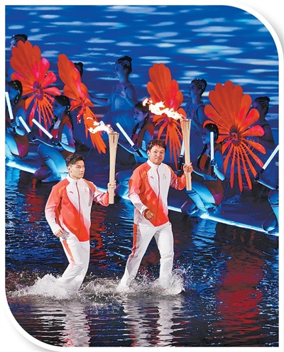 乒乓球奧運冠軍馬琳和跳水奧運冠軍陳若琳高擎第一棒火炬踏浪而來,經過黃金寶、方文浩、郭晶晶、王欣瑜、王柳懿、王芊懿、梁偉鏗、賴宣治、冼東妹、容志行的傳遞,火炬最終交到來自粵港澳三地的運動員蘇炳添、張家朗和李祎手中。