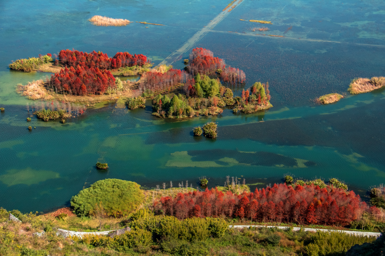 在云南省文山壯族苗族自治州丘北縣普者黑,水杉披上緋紅與金黃,在青黛峰林間勾勒出初冬最溫柔的色彩,層林盡染,丹青自成,仿佛天地調和了墨色,暈開濃淡相宜的冬韻。