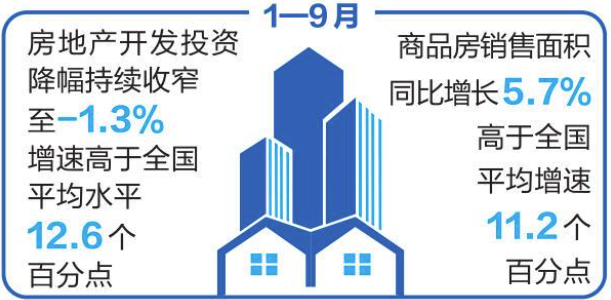 今年以來,在政策措施加持和各地各部門協(xié)同發(fā)力下,我省房地產(chǎn)市場不斷回穩(wěn)向好,1—9月,全省房地產(chǎn)開發(fā)投資降幅持續(xù)收窄至-1.3%,增速高于全國平均水平12.6個(gè)百分點(diǎn),增速居全國第五位。其中,住宅開發(fā)投資同比增長3.2%,已連續(xù)8個(gè)月同比增長。同時(shí),全省商品房銷售面積同比增長5.7%,連續(xù)6個(gè)月保持正增長,高于全國平均增速11.2個(gè)百分點(diǎn),全省二手房成交面積也同比增長13.5%;房價(jià)保持穩(wěn)定,全省商品房均價(jià)6590元/平方米,浮動(dòng)幅度穩(wěn)控在合理區(qū)間;庫存加快去化,截至9月底,全省商品住宅庫存去化周期縮短至17.4個(gè)月。