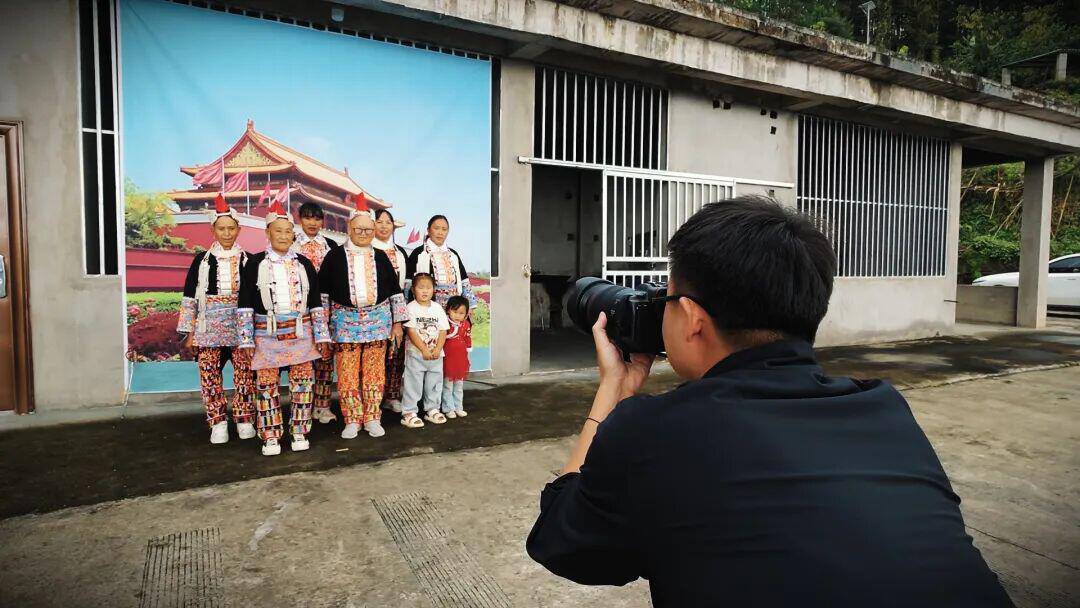 這份顧慮在村組長第一個(gè)出現(xiàn)在鏡頭前時(shí)煙消云散。隨后,朱國慶和朋友們挨家挨戶邀請(qǐng)老人們拍照。起初,老人們還略帶羞澀:“都是老頭老太太,沒穿好看的衣服,有啥好照的?”可當(dāng)聽到“是和天安門合影”時(shí),老人們瞬間眼前一亮,紛紛回到房間換上最干凈、最漂亮的民族服飾。李成明爺爺一邊整理衣角一邊念叨“七八十歲了,照出來難看”,但嘴角的笑容卻藏不住內(nèi)心的喜悅。