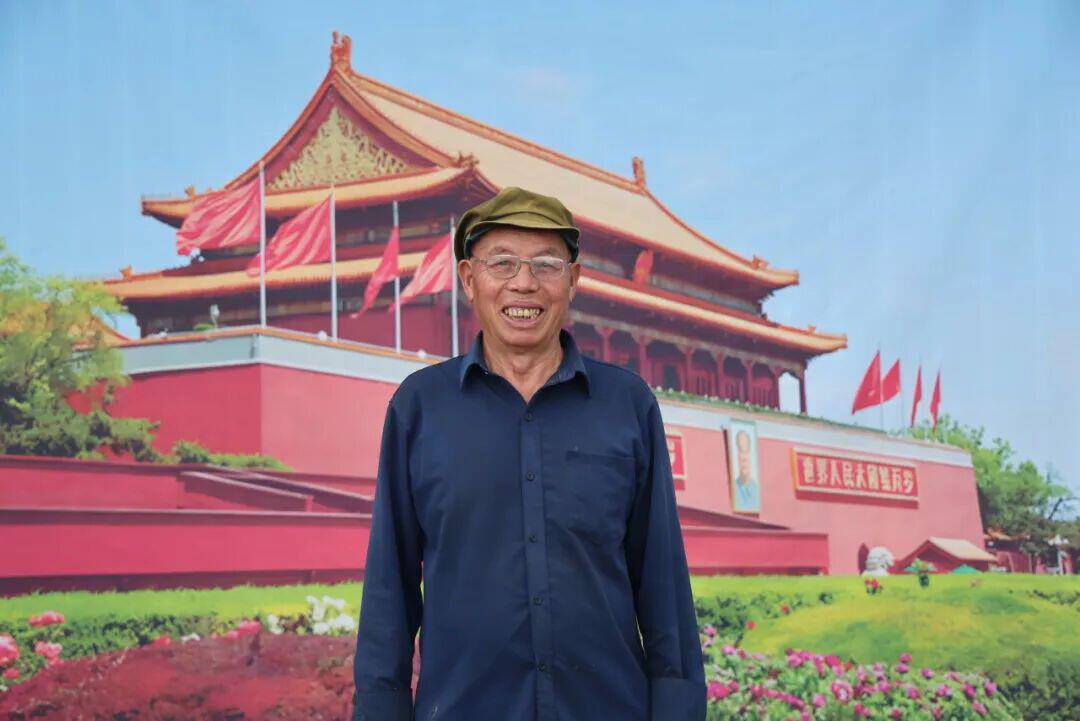 李成明爺爺在以天安門為背景的畫布前開心拍照