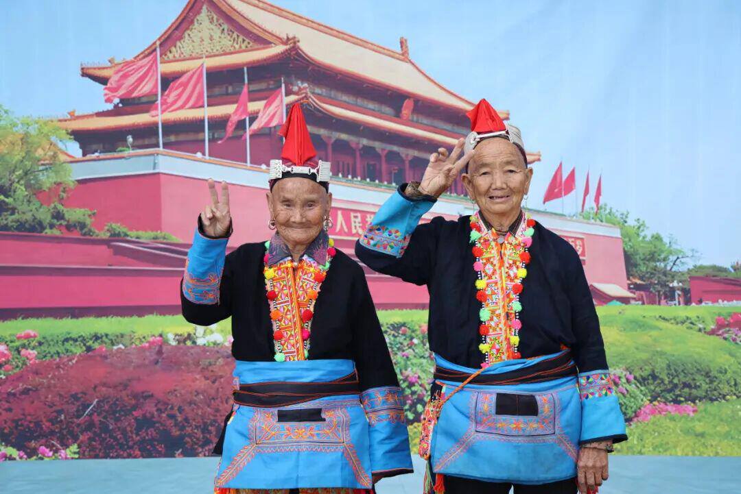 云南金平金河鎮(zhèn)瑤家新寨盤三妹奶奶和自己的妹妹在以天安門為背景的畫布前開心拍照