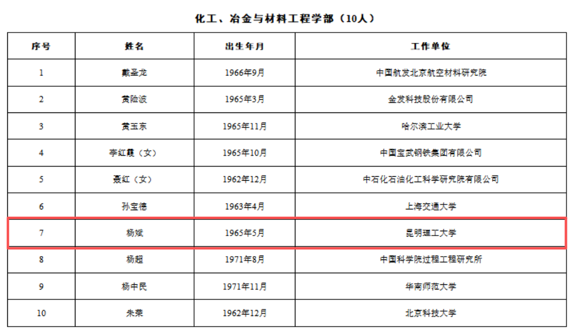 11月21日,2025年兩院院士增選結果正式揭曉,共有144人當選。云南省昆明理工大學楊斌當選為中國工程院化工、冶金與材料工程學部院士。