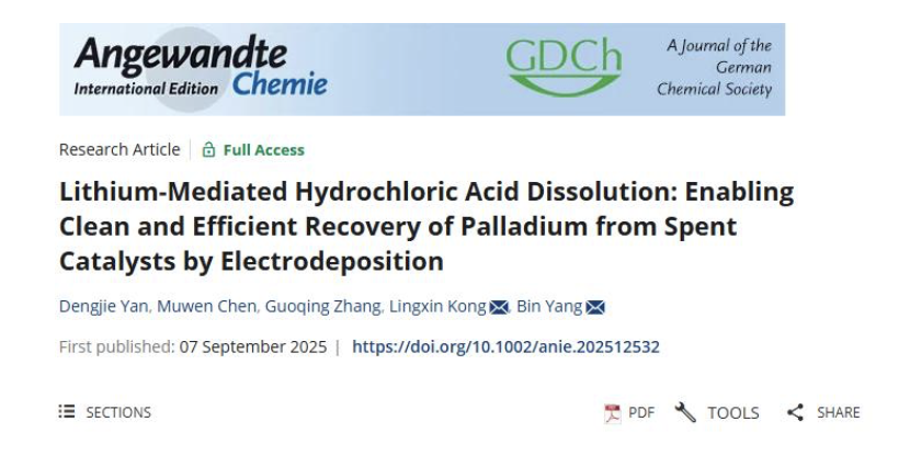相關成果以“Lithium-Mediated Hydrochloric Acid Dissolution: Enabling Clean and Efficient Recovery of Palladium from Spent Catalysts by Electrodeposition”為題發表在化學領域頂級期刊《Angewandte Chemie International Edition》上。