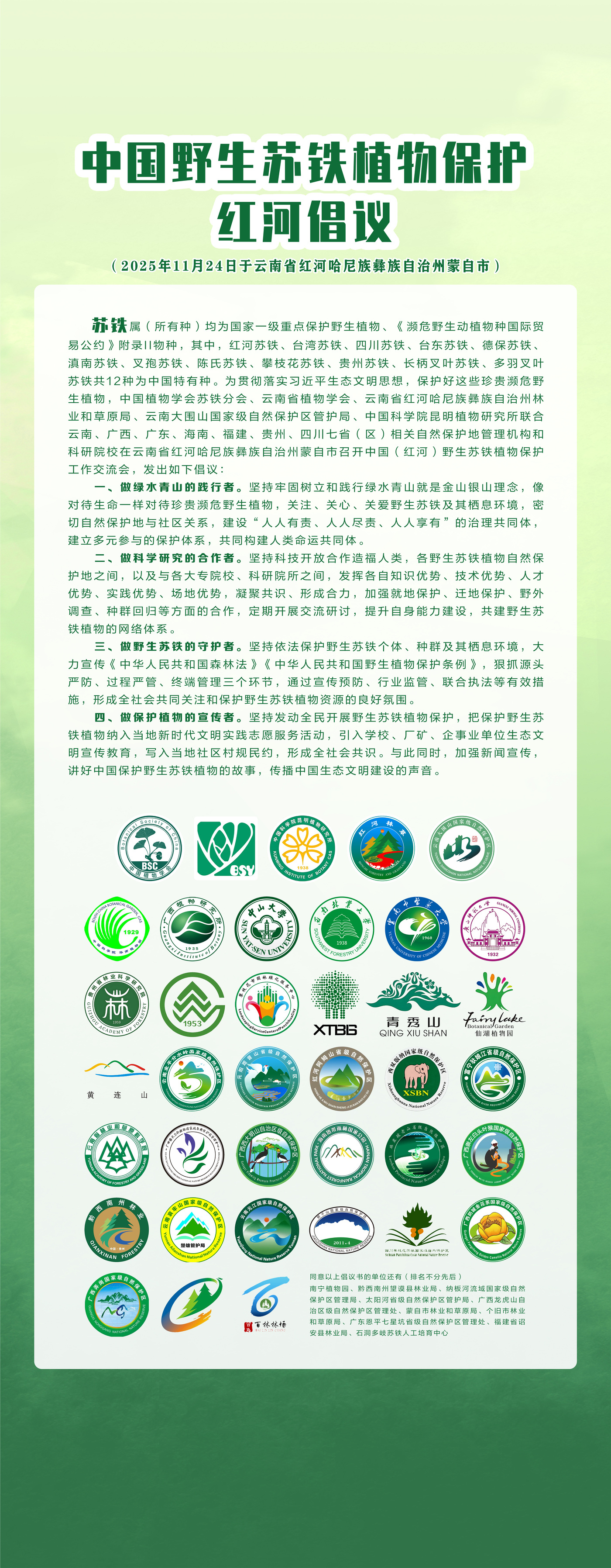 為有效保護蘇鐵屬植物,中國植物學會蘇鐵分會、云南省植物學會、紅河州林業和草原局、云南大圍山國家級自然保護區管護局、中國科學院昆明植物研究所聯合云南、廣西、廣東、海南、福建、貴州、四川七省(區)相關自然保護地管理機構和科研院校,在會議期間正式發布《中國野生蘇鐵植物保護紅河倡議》。