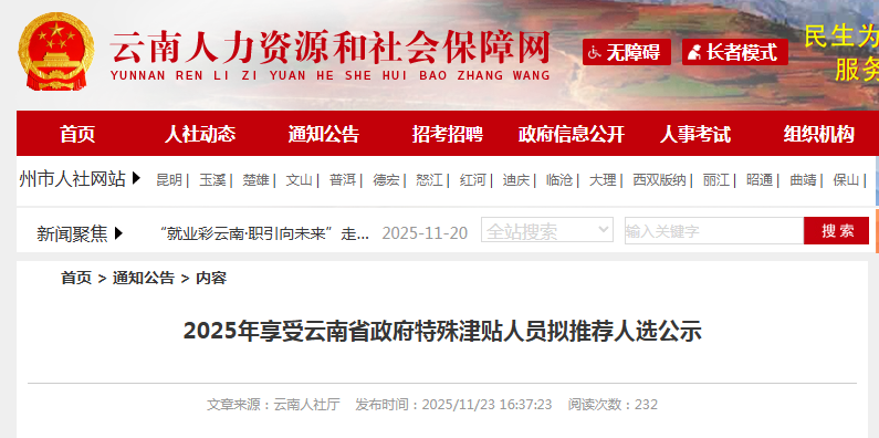 根據《云南省人力資源和社會保障廳關于開展2025年享受云南省政府特殊津貼人員推薦選拔工作的通知》精神,經單位推薦、逐級審查和專家評審,現將2025年享受云南省政府特殊津貼人員擬推薦人選(名單附后)予以公示,公示期為5個工作日(11月24日至11月28日)。
