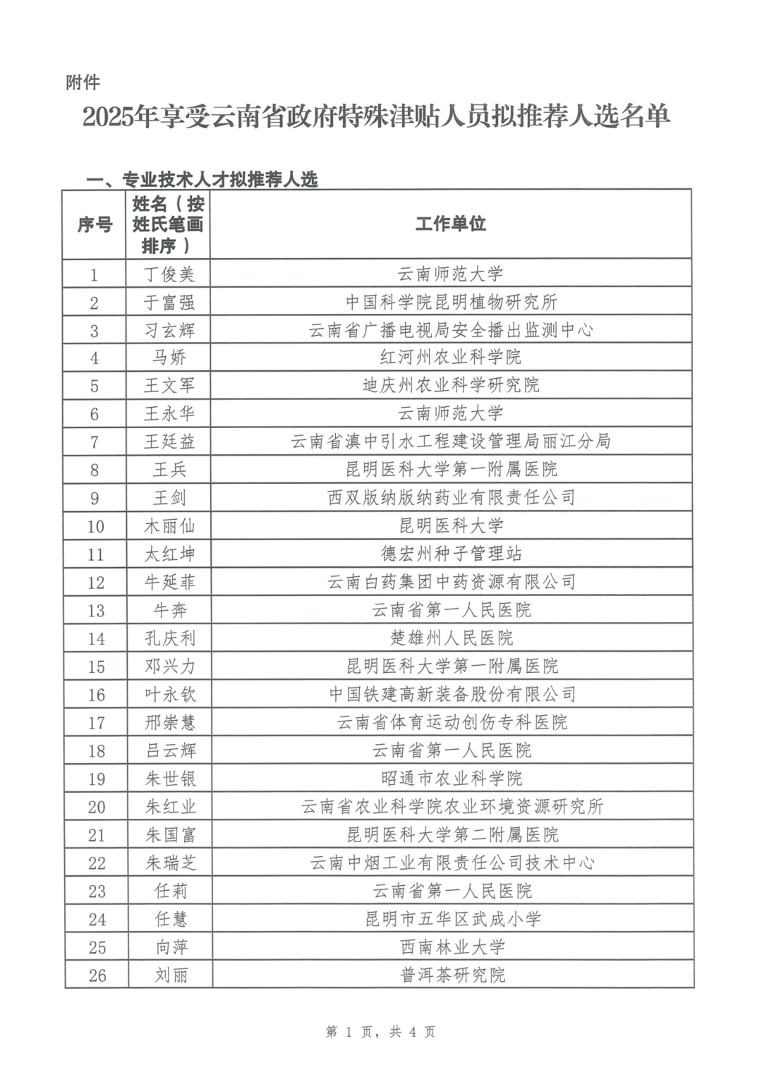 附件: 2025年享受云南省政府特殊津貼人員擬推薦人選名單