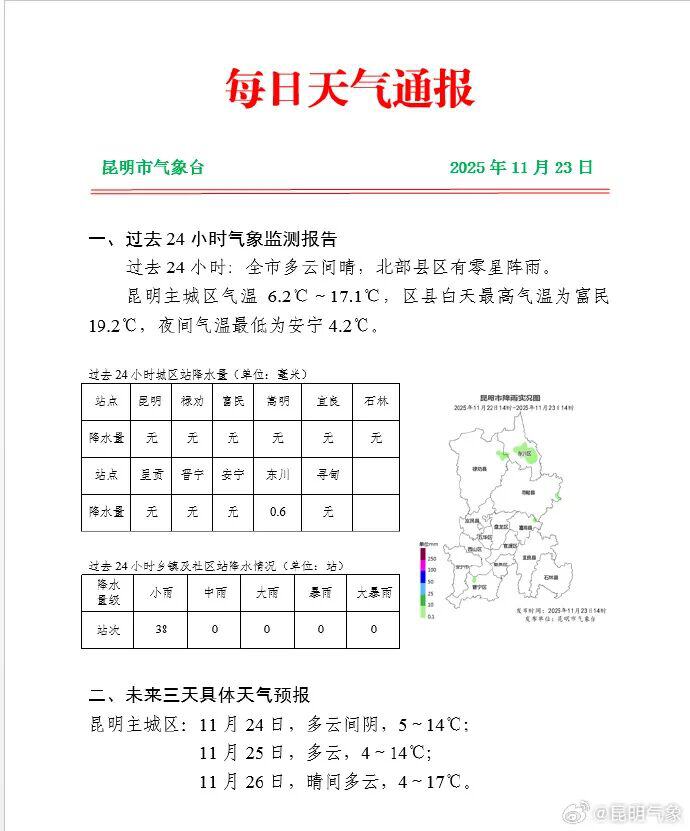 11月24日20時到11月25日20時:迪慶州高海拔地區陰有小雪或雨夾雪,昆明市北部、楚雄州、麗江市、迪慶州、怒江州北部、大理州、臨滄市東部、普洱市陰天間多云局部有小雨、中雨,其他地區晴間多云。