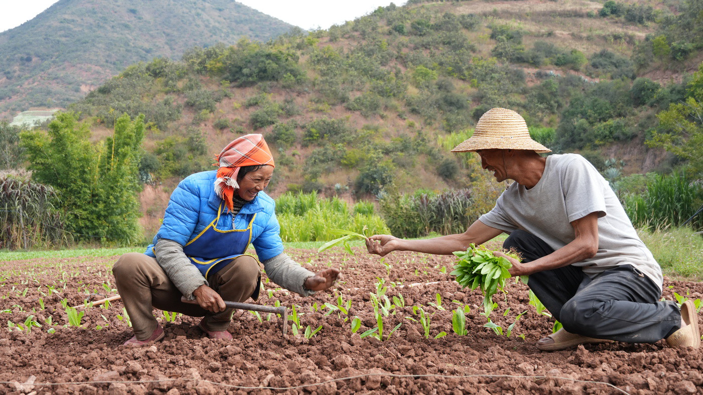 冬日,走進大理白族自治州祥云縣鹿鳴鄉大凹奈村,山間梯田里的貢菜幼苗翠綠鮮嫩,在微風中輕輕搖曳;遠處田壟上,成片的蘿卜花綴成淺白花海;坡地間的優質牧草長勢喜人,連片翠綠鋪展至山腳,一幅鄉村產業振興的畫卷在眼前展開。