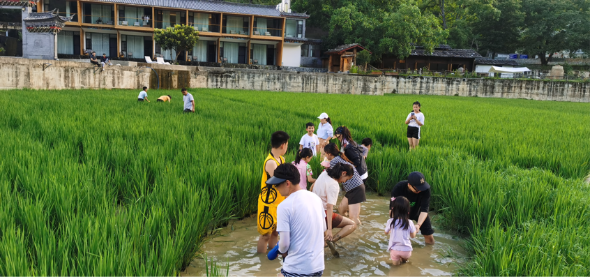 親子游客在啟別村稻田間體驗摸魚。受訪者 供圖
