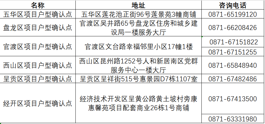 不具備網絡辦理項目戶型確認條件的申請人,可到昆明市主城區任一公共租賃住房項目戶型確認點辦理。辦理時間為12月8日(星期一)至12月12日(星期五),上午9:00-12:00下午 13:30-17:00。