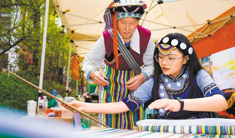 4月21日,游客在貢山縣丙中洛鎮(zhèn)體驗怒族織毯非遺技藝。 高玉生攝 (中經(jīng)視覺)
