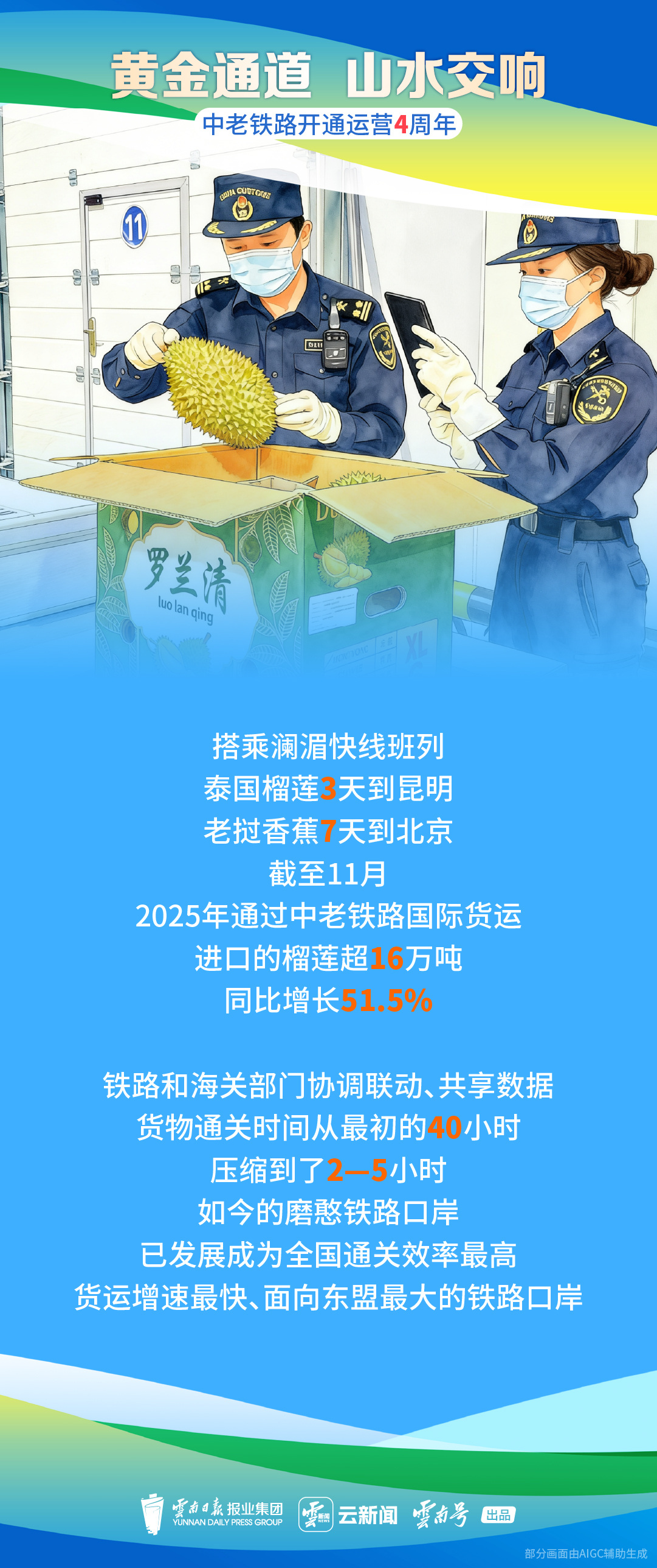 中老鐵路通車4年來(lái),鐵路和海關(guān)部門(mén)協(xié)調(diào)聯(lián)動(dòng)、共享數(shù)據(jù),不斷提升通關(guān)智能化、數(shù)字化和便利化水平,推動(dòng)鐵路貨運(yùn)樞紐向現(xiàn)代綜合物流樞紐轉(zhuǎn)型,企業(yè)可提前一站式辦理申報(bào)、查驗(yàn)等手續(xù),貨物運(yùn)抵磨憨口岸后無(wú)需停留,直接通關(guān),貨物通關(guān)時(shí)間從最初的40小時(shí)壓縮到了2—5小時(shí)。如今的磨憨鐵路口岸,已發(fā)展成為全國(guó)通關(guān)效率最高、貨運(yùn)增速最快、面向東盟最大的鐵路口岸。