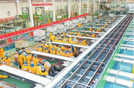 圖為工人們?cè)诠旧a(chǎn)線(xiàn)上分選蘋(píng)果。(記者 周燦 攝影報(bào)道)