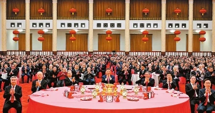 人民大會(huì)堂宴會(huì)廳燈光璀璨、暖意融融,各界人士2000多人歡聚一堂、共迎佳節(jié),現(xiàn)場洋溢著歡樂祥和的節(jié)日氣氛。