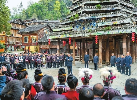 17日下午,習近平來到黔東南州黎平縣肇興侗寨考察。寨門口,身著民族盛裝的村民唱起侗族大歌歡迎總書記。習近平饒有興致地聽取侗族大歌的藝術起源、曲調特點、演唱形式等方面介紹。隨后,沿著村寨路道察看侗寨風貌和旅游商鋪,不時駐足與店主、游客、村民互動交談。在侗族文化展示中心,他詳細了解侗族歷史、風俗和服飾、建筑等特色文化保護傳承情況。在侗鄉特色產業基地,他觀看蠟染工藝流程,對蠟染合作社堅持顧客至上、質量第一的運營理念給予肯定。習近平指出,少數民族文化是中華文化不可或缺的組成部分,既要保護有形的村落、民居、特色建筑風貌,傳承無形的非物質文化遺產,又要推動其創造性轉化、創新性發展,讓民族特色在利用中更加鮮亮,不斷煥發新的光彩。