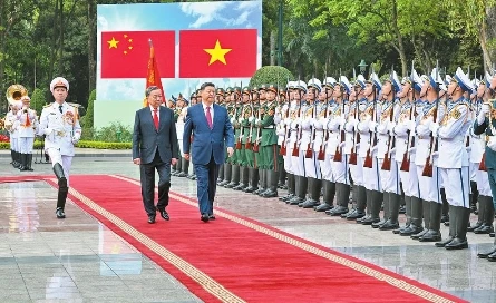 四月十四日,中共中央總書記、國家主席習近平抵達河內對越南進行國事訪問。當日下午,越共中央總書記蘇林為習近平舉行隆重歡迎儀式。這是習近平在蘇林陪同下檢閱儀仗隊。新華社記者 李學仁 攝