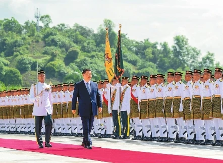 習近平乘車抵達時,易卜拉欣和馬來西亞總理安瓦爾在下車處熱情迎接。兩國元首登上檢閱臺,軍樂團奏中馬兩國國歌,鳴禮炮21響。習近平檢閱儀仗隊。兩國元首進入國家王宮大廳,同雙方陪同人員握手致意。