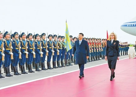 俄方在機場舉行隆重迎接儀式。軍樂團奏中俄兩國國歌。習近平檢閱儀仗隊并觀看分列式。