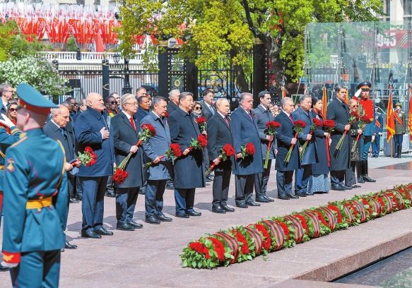 當地時間5月9日,俄羅斯舉行盛大慶典,紀念蘇聯偉大衛國戰爭勝利80周年。國家主席習近平和來自世界20多個國家及國際組織領導人應邀出席慶典。慶典結束后,習近平同其他國家領導人一起從紅場來到亞歷山大花園,向無名烈士墓獻花,并肅立默哀。 新華社記者 翟健嵐 攝