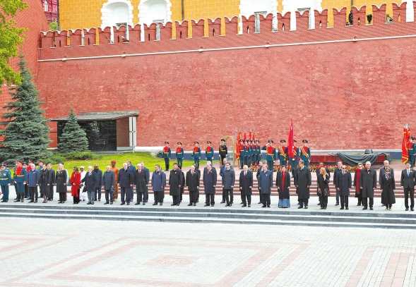 慶典結束后,習近平同其他國家領導人一起從紅場來到亞歷山大花園,向無名烈士墓獻花,并肅立默哀。隨后,各國領導人集體合影留念。