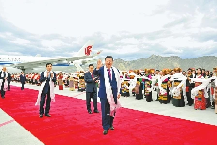 新華社拉薩8月20日電 中共中央總書記、國家主席、中央軍委主席習近平率中央代表團20日中午乘專機抵達拉薩,出席西藏自治區成立60周年慶祝活動。習近平作為中共中央總書記、國家主席、中央軍委主席率中央代表團到西藏出席西藏自治區成立慶祝活動,在黨和國家歷史上是第一次,充分體現了黨中央對西藏工作的高度重視、對西藏各族干部群眾的親切關懷。